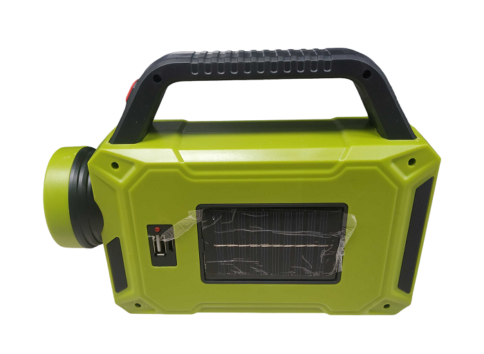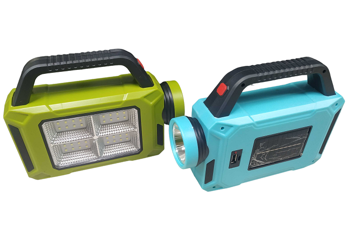 Επαναφορτιζόμενος φακός χειρός LED με μπροστινό φακό, ισχυρό πλαϊνό προβολέα και οπίσθιο φακό.