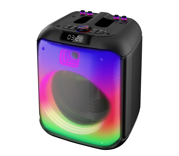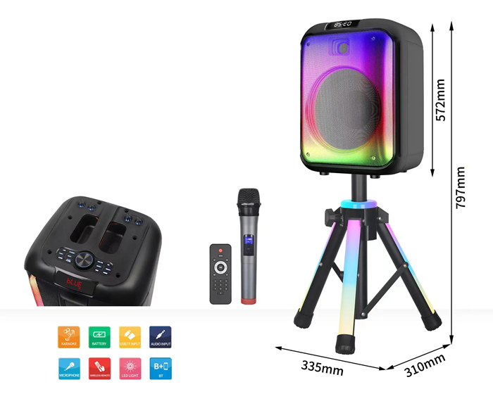 Φορητό ηχείο subwoofer με ήχο εξαιρετικής ποιότητας και φωτισμό LED RGB που προσαρμόζεται στο ρυθμό της μουσικής σας και δημιουργεί εντυπωσιακή ατμόσφαιρα στο πάρτυ σας. Περιλαμβάνει 1 ασύρματο μικρόφωνο καραόκε, τηλεχειριστήριο πλήρους χειρισμού και βάση-τρίποδα με φωτισμό LED.