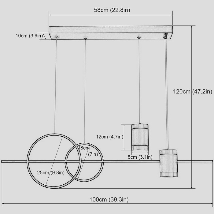 Χαρακτηριστικά: Ισχύς:50W/4000lm, Τάση: 85-260V, Διαστάσεις: 100cm (πλάτος) x 120cm (max κρεμαστό μήκος ρυθμιζόμενο). Μήκος πλαφονιέρας οροφής: 58cm. (βλ. εικόνα)