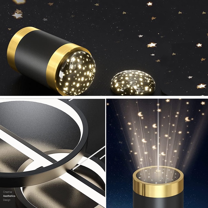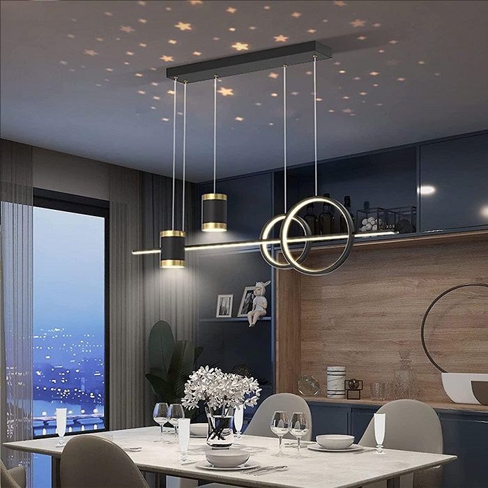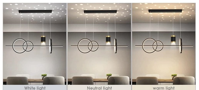 Φωτιστικό οροφής/τραπεζαρίας LED κρεμαστό με ενσωματωμένο φωτορυθμικό με σχέδιο αστέρια, σε εντυπωσιακό σχεδιασμό που θα προσδώσει στον χώρο σας πρωτοποριακό, μοντέρνο στυλ. Διαθέτει 3 χρωματισμούς φωτισμού και εύρος θερμοκρασίας φωτισμού 3000-6000Κ για θερμό,ψυχρό ή ουδέτερο φωτισμό, ανάλογα με τις ανάγκες του χώρου σας. Κάθε φορά που σβήνετε και ανάβετε άμεσα το φωτιστικό εμφανίζει διαφορετικό φωτισμό.