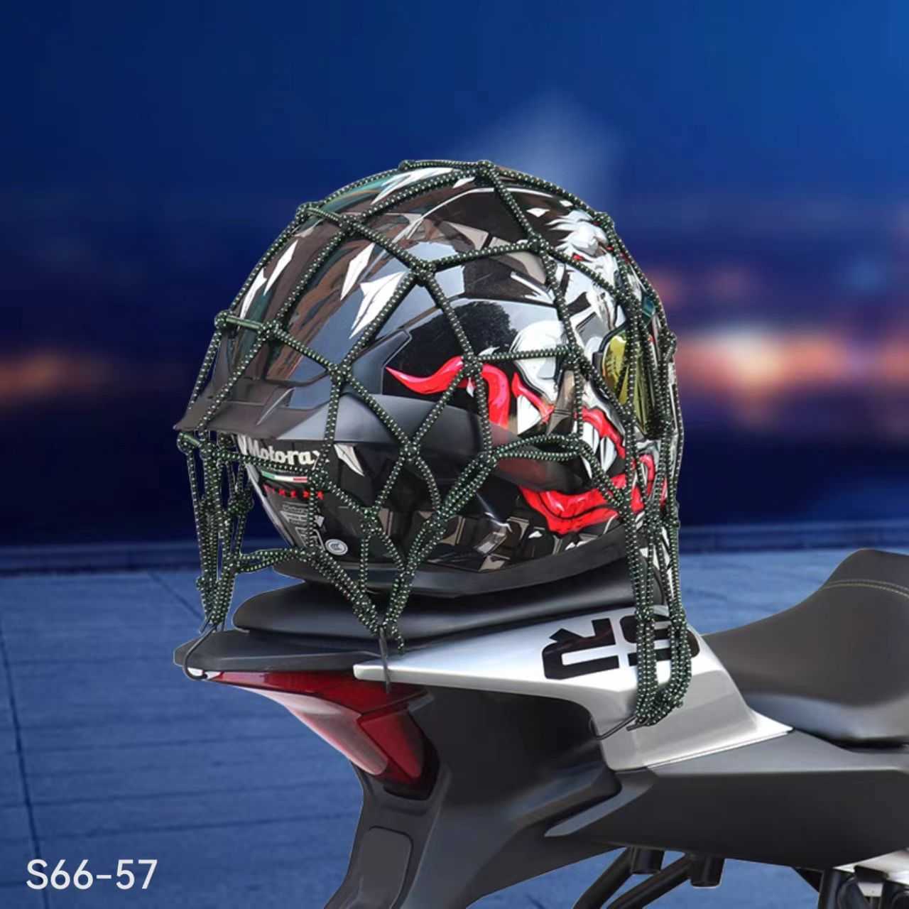 Ελαστικό Δίχτυ Αποσκευών μοτοσυκλέτας & ποδηλάτου, με εργονομικό σχεδιασμό και κατασκευή υψηλής ανθεκτικότητας, που διατηρεί το κράνος ή τα μεταφερόμενα αντικείμενα σταθερά στη σχάρα ή στο ντεπόζιτο. Ισχυρή νάιλον ίνα με πυρήνα λατέξ.